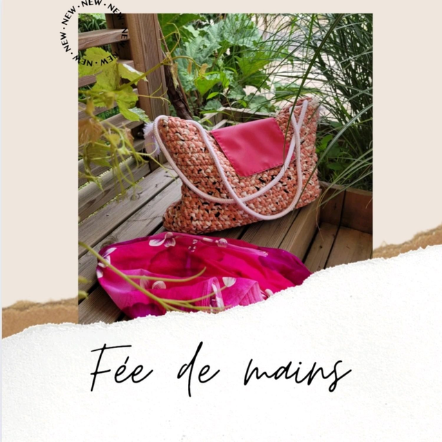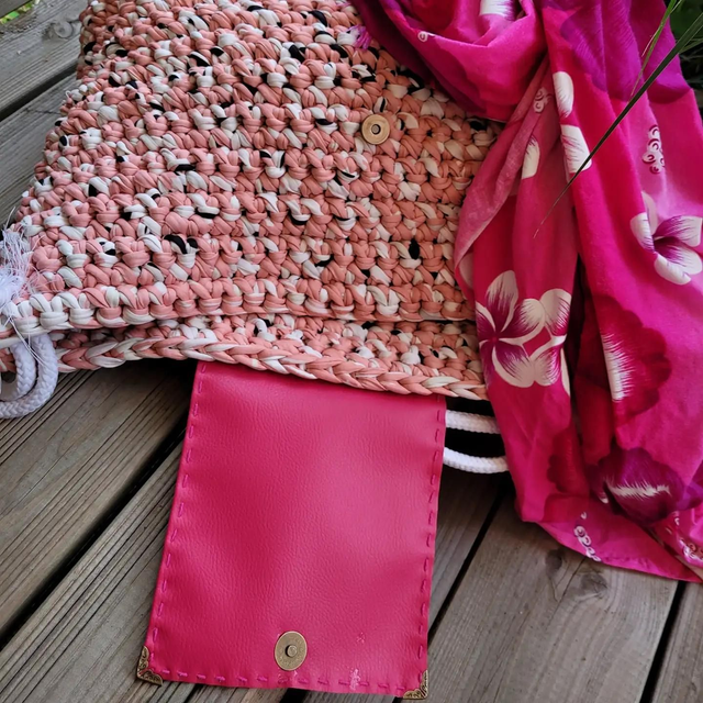 Sac réalisé au crochet avec du fil t-shirt recyclé de couleur rose et blanc .