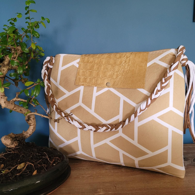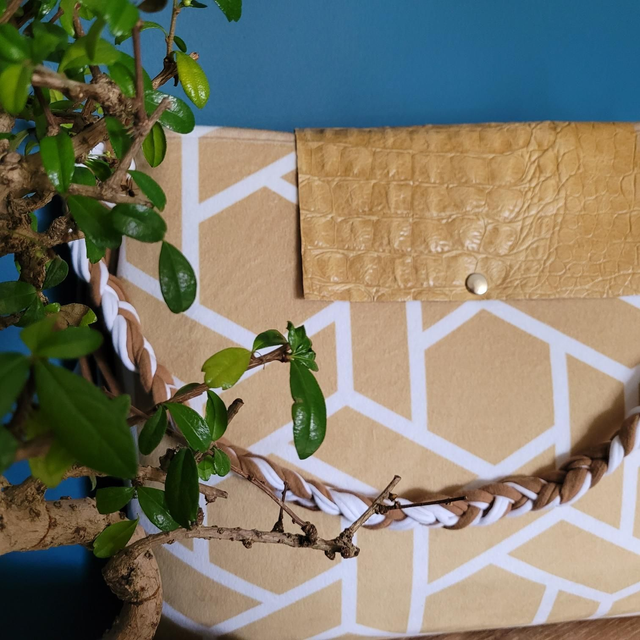 en polyester, rabat cuir véritable et anse tressée en fil t-shirt recyclé.
