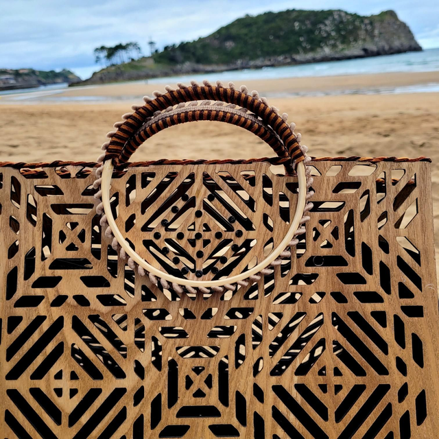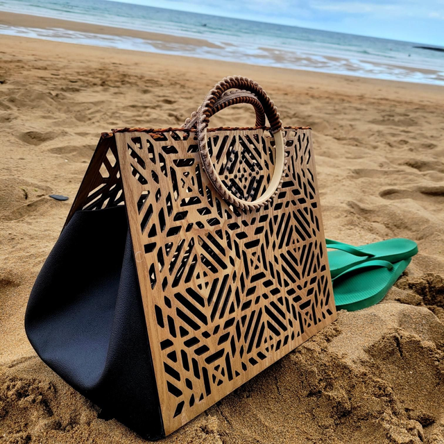 Sac en bois et simili cuir noir.