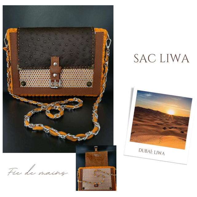 Sac crocheté au fil tee-shirt recyclé, véritable cuir d'autruche et pochette troué en aluminium.
