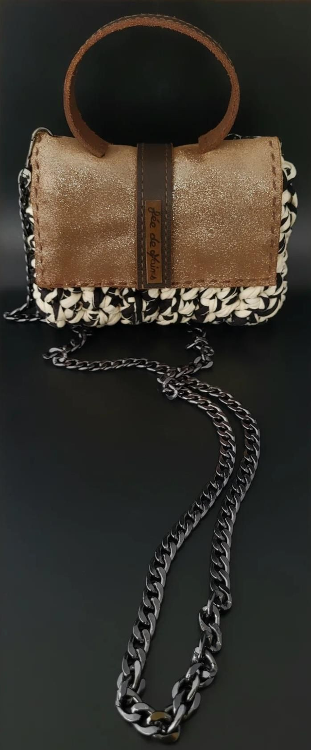 Matières : fil tee-shirt et cuir .