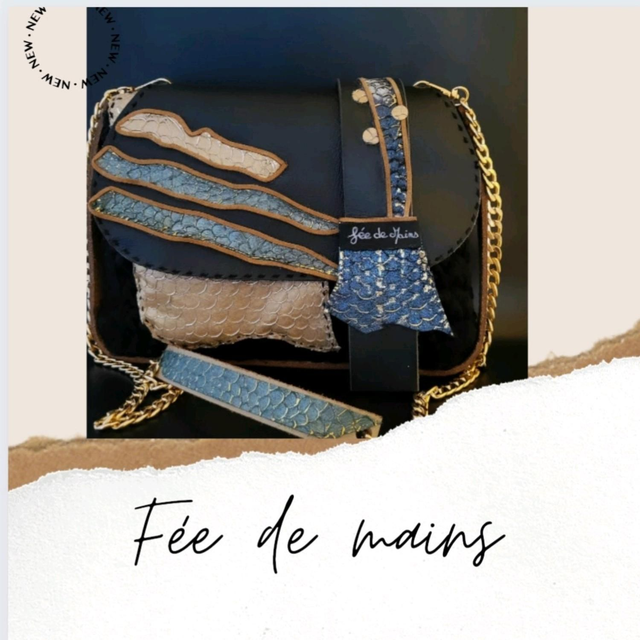 Sac "Pilat " crocheté à la main avec du fil tee-shirt et déco cuir de poisson cousu mains.